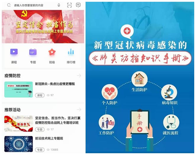 2020年伊始,突如其來(lái)的新型冠狀病毒疫情牽動(dòng)著所有人的心。航天科工積極響應(yīng)政府號(hào)召,落實(shí)重大突發(fā)公共衛(wèi)生事件一級(jí)響應(yīng)機(jī)制,先后兩次調(diào)整恢復(fù)上班時(shí)間。在一個(gè)隔絕疫情,不隔絕愛(ài)的特殊時(shí)期,航天云課堂深入落實(shí)集團(tuán)公司黨組要求,為集團(tuán)公司全體黨員和廣大職工精心策劃了“堅(jiān)定信念、擔(dān)當(dāng)作為,堅(jiān)決打贏疫情防控阻擊戰(zhàn)”網(wǎng)上專(zhuān)題培訓(xùn)班,并上線“新冠肺炎,焦慮比疫情更糟糕——如何控制好自己的壞情緒”和“新型冠狀病毒感染的《肺炎防控知識(shí)手冊(cè)》”兩門(mén)特色課程。