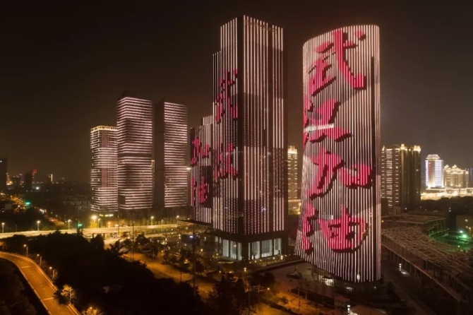 1月31日,武漢市武昌區(qū)高層建筑外墻打出“武漢加油”字樣(無人機照片)。來源:新華社