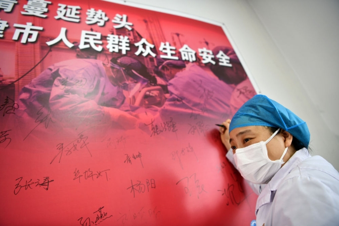 ▲2月2日,在天津市海河醫(yī)院,被從“紅區(qū)”替換出來(lái)的醫(yī)生劉聰正在宣傳畫(huà)上留下簽名。新華社記者李然攝