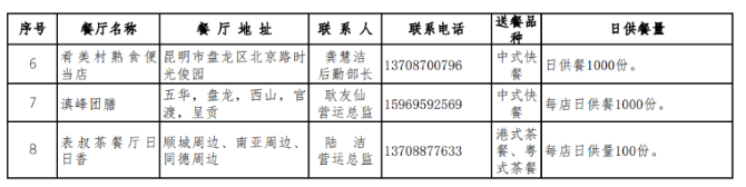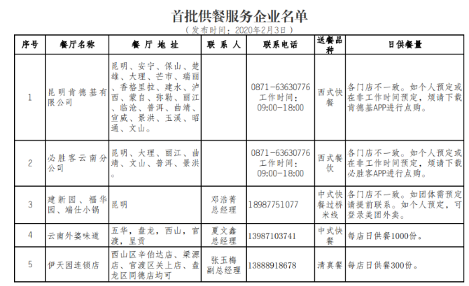 為配合云南省應(yīng)對(duì)新型冠狀病毒感染肺炎疫情工作,避免人員密集就餐,防止群體性聚餐可能引發(fā)的風(fēng)險(xiǎn),根據(jù)《云南省機(jī)關(guān)事業(yè)單位春節(jié)收假疫情防控指南》(省委省政府應(yīng)對(duì)新型冠狀病毒感染肺炎疫情工作領(lǐng)導(dǎo)小組指揮部通告第5號(hào))和《商務(wù)部辦公廳關(guān)于進(jìn)一步強(qiáng)化生活必需品市場供應(yīng)保障工作的通知》要求,省商務(wù)廳聯(lián)合省餐飲與美食行業(yè)協(xié)會(huì)積極發(fā)動(dòng)我省餐飲企業(yè)充分發(fā)揮行業(yè)優(yōu)勢,調(diào)整經(jīng)營策略,履行社會(huì)責(zé)任,向我省機(jī)關(guān)、團(tuán)體和企事業(yè)單位提供集體用餐供配送服務(wù)保障。2月3日,省商務(wù)廳向社會(huì)發(fā)布肯德基、建新園、外婆味道等8家首批供餐名單。