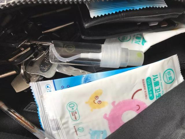 “老婆把我的這個(gè)小包包都裝滿了,又是酒精噴霧又是濕紙巾。這一切都是她滿滿的愛(ài)。”