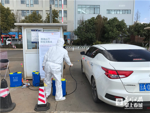 在滴滴昆明司機(jī)防疫服務(wù)站,工作人員正為車輛進(jìn)行免費(fèi)消毒