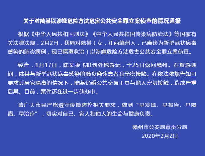 2月4日,西雙版州景洪市應(yīng)對新型冠狀病毒感染肺炎疫情工作領(lǐng)導(dǎo)小組指揮部對外發(fā)布消息稱,景洪市新型冠狀病毒感染肺炎確診病例酈某某,涉嫌以危險(xiǎn)方法危害公共安全罪,被公安機(jī)關(guān)立案偵查。