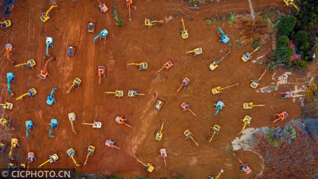 2020年1月24日,大年三十,上百臺(tái)挖機(jī)進(jìn)場作業(yè),火神山醫(yī)院正式施工。CICPHOTO 黃蕾/攝