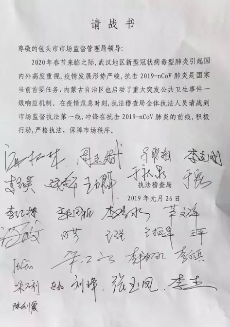 一封請戰(zhàn)書,字不多,卻在空白處滿滿簽下28個人的名字,字跡慷慨!灑脫!!激昂?。?!整整一頁紙裝滿的不是幅面,而是初心、使命、責任、擔當……為貫徹落實黨中央、國務院和自治區(qū)黨委政府、包頭市委市政府《關于新型冠狀病毒感染的肺炎防控工作》的決策部署,現(xiàn)將疫情防控作為重大政治任務,堅決做好疫情防控工作。作為包頭市場監(jiān)管人,主動放棄春節(jié)假期與家人團聚的機會,堅守崗位、履職盡責,自除夕當天,就堅定邁步走在了對食品、藥品、餐飲、醫(yī)療機構、醫(yī)療器械企業(yè),生產(chǎn)和流通企業(yè)以及集貿(mào)市場、大中型超市、酒店等市場經(jīng)營主體的巡查檢查道路上,踏石留印,抓鐵有痕,只為一個共同心愿——抗擊新型冠狀病毒感染的肺炎疫情,共度時艱!