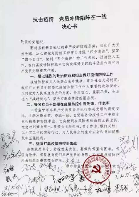 面對疫情,山東省臨沂市市場監(jiān)督管理局向全體黨員發(fā)出抗擊疫情黨員沖鋒陷陣在一線號召,機關各支部積極響應,組織支部黨員在決心書上簽字,一致表態(tài)要以強烈的政治使命和責任擔當主動做好疫情防控工作,在疫情防控阻擊戰(zhàn)中,沖鋒在前、奮戰(zhàn)一線,當先鋒、作表率,堅定執(zhí)行市局黨組的調度安排,自覺在防治疫情工作中接受黨性鍛煉和實踐考驗,做到在風險考驗面前無畏無懼,危急時刻挺身而出,以扎實工作的實際行動,發(fā)揮好支部戰(zhàn)斗堡壘作用和共產(chǎn)黨員先鋒模范作用,為人民群眾的生命安全和身體健康筑牢堅強防線。