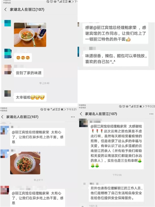 記者了解到,滯留在麗江的湖北籍游客還建了名叫“家湖北人在麗江”的微信群。群里的聊天記錄也見(jiàn)證了工作人員和湖北籍游客從素不相識(shí)到相親相愛(ài)的過(guò)程。