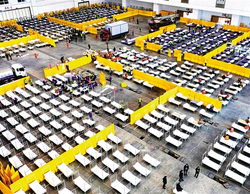 2月4日拍攝的改造中的武漢客廳內(nèi)部(無人機(jī)照片)。 2月3日晚,3所“方艙醫(yī)院”在武漢開建,至4日早上,已搭起數(shù)百張臨時(shí)病床。 新華社記者 才 揚(yáng)攝