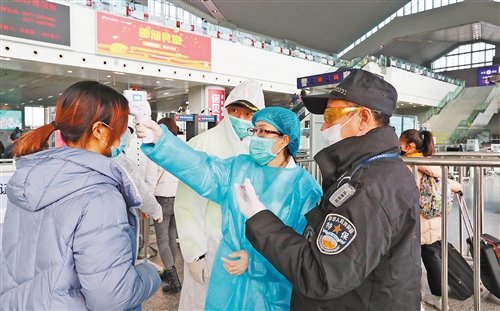 上圖 2月2日上午,溫州火車南站醫(yī)務(wù)人員對旅客進行仔細篩查。趙 用攝(中經(jīng)視覺)