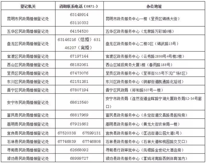 昆明市各婚姻登記處聯(lián)系咨詢電話