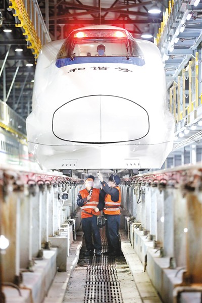 2月1日凌晨,南昌車(chē)輛段南昌西動(dòng)車(chē)所動(dòng)車(chē)組機(jī)械師正在檢修動(dòng)車(chē)組車(chē)頭底部部件。丁波/攝(人民視覺(jué)) |