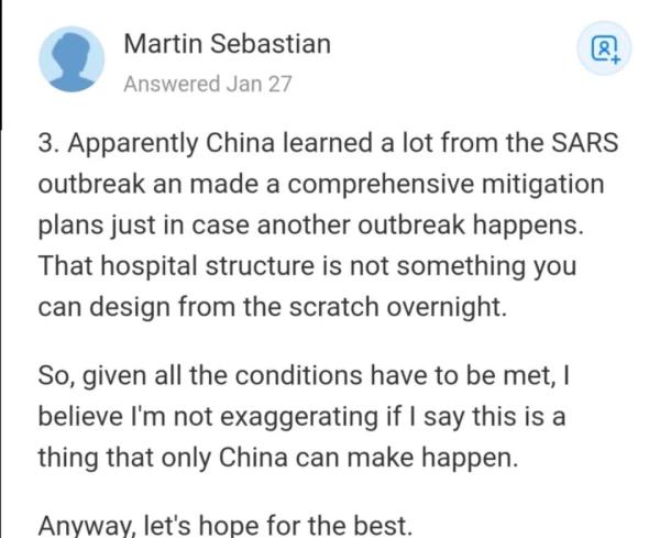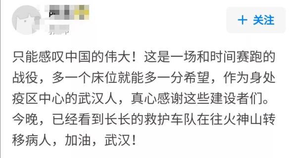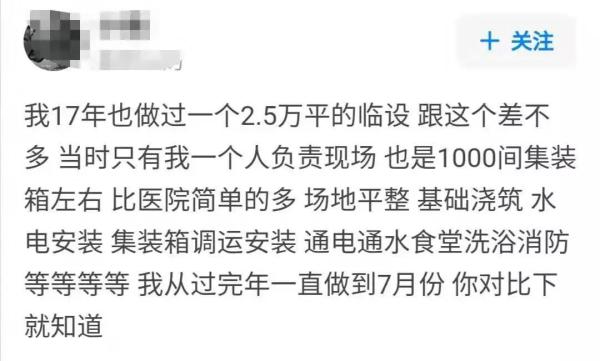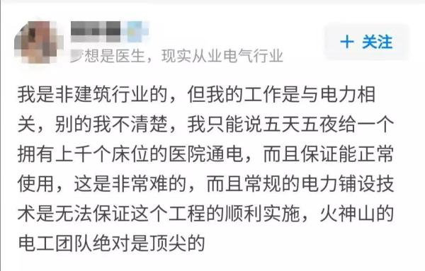 ? “非典”給中國留下了經(jīng)驗,中國構建了一套應對類似疫情爆發(fā)的綜合應急體制機制?;鹕裆结t(yī)院的架構不是說你對著圖紙構思一晚上就能搞出來的。綜合上述幾點,不吹不黑,我覺得這件事只有中國能做到??傊敢磺卸己冒?。