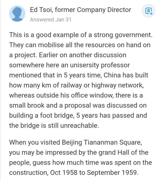 ? 這說明了什么是一個強有力的政府,有能力調(diào)度手中的一切資源保證項目實施的能力。前段時間,一個大學教授也提出了類似的問題:五年時間里中國建好了若干條鐵路和高速路,而同樣的5年,由于教授辦公室外有一條溪流,所以建不建橋還在討論,工程一直擱淺。