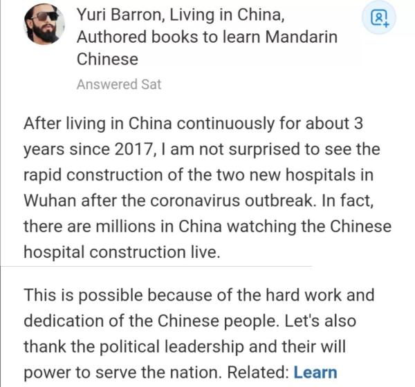 ? 從2017年開始,我已在中國待了三年。我不奇怪,在疫情爆發(fā)后,兩座醫(yī)院在武漢迅速開工、拔地而起。不瞞你說,當時還有數(shù)百萬網(wǎng)民在看醫(yī)院建設的直播呢。中國完成此舉,靠的是中國人民的勤勞上進、忠誠奉獻。要感謝中國的執(zhí)政黨,感謝他們?yōu)檫@個國家服務的意志和決心。