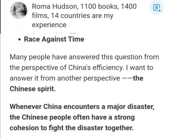 ? 很多人從中國效率這個角度談的,我想從另外一個角度談談,中國精神。當重大災難降臨,這個國家的人民就會爆發(fā)出一股強大的凝聚力戰(zhàn)勝災難。