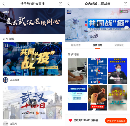 新型冠狀病毒感染的肺炎疫情防控工作開展以來,眾多媒體與快手合作,通過“短視頻+直播”的形式開展疫情報道。內(nèi)容既包括國務(wù)院新聞辦公室、國家衛(wèi)健委等部委的疫情發(fā)布會,也包括湖北、北京、上海、浙江、廣東、山東等地方政府的疫情發(fā)布會,以及各地區(qū)醫(yī)療力量馳援武漢火神山、雷神山醫(yī)院建設(shè)等內(nèi)容。