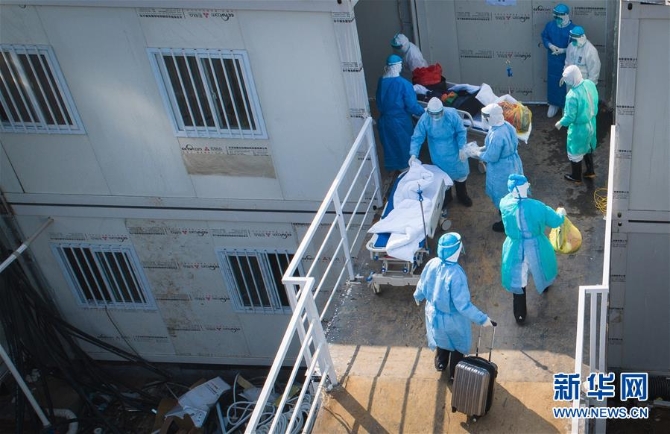 2月4日,醫(yī)護人員將患者送入病房(無人機照片)。 當日,武漢火神山新型冠狀病毒感染肺炎??漆t(yī)院開始正式接診新型冠狀病毒感染的肺炎確診患者。新華社記者 肖藝九 攝