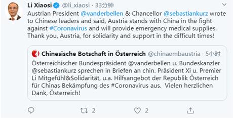 中國駐奧地利共和國大使李曉駟在社交媒體上發(fā)文感謝奧地利對中國的支持。