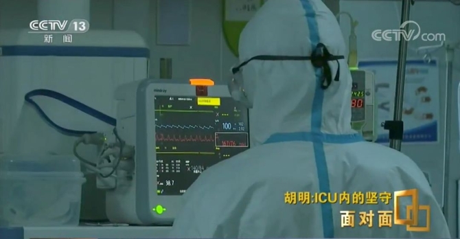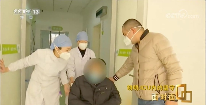 記者來到武漢肺科醫(yī)院時(shí),胡明正在開晨會(huì),臉上除了疲憊看不出不適的樣子,但經(jīng)旁人告知,前幾天他病了。胡明:現(xiàn)在好多了,估計(jì)是前幾天做完ECMO后出了一大身汗,又去查房,出來后受涼了。做CT沒什么病變,應(yīng)該不是新冠肺炎。有點(diǎn)低燒,估計(jì)就是沒休息好。院長(zhǎng)把胸牌給收了,不讓我進(jìn)ICU病房。進(jìn)不去病房,胡明就在外面遙控指揮,但他心里一直牽掛著前幾天還病情危重的袁海濤。好在袁海濤的情況也大為好轉(zhuǎn),已經(jīng)連續(xù)三次核酸檢測(cè)陰性。