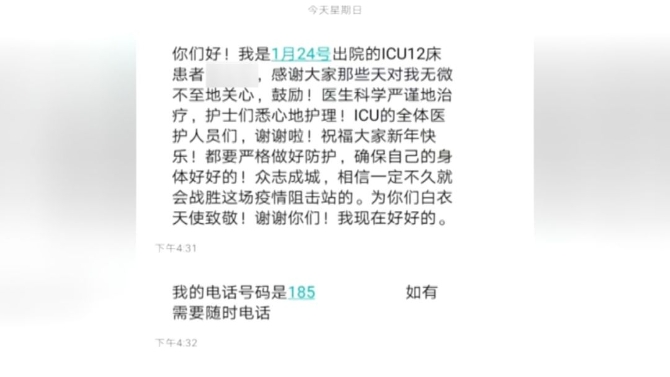 胡明:患者出院那天,他家人在門口守了好幾個(gè)小時(shí),拎了一大堆水果準(zhǔn)備感謝醫(yī)護(hù)人員。但我們當(dāng)時(shí)穿著隔離服去接新病人,點(diǎn)了個(gè)頭就趕緊走了。后來他寫了封感謝信,大家都非常高興。當(dāng)我們說要從已經(jīng)恢復(fù)的病人中,提取一點(diǎn)血漿中的抗體,嘗試研制一些新的預(yù)防性藥物,他(康復(fù)病人)也主動(dòng)留下電話,表示隨叫隨到。記者:這種喜悅和發(fā)自內(nèi)心的感謝,能帶給你什么?胡明:認(rèn)可!人家認(rèn)可你了,沒白忙活,為他付出了那么多,醫(yī)務(wù)人員都覺得值得。一句話,值得!