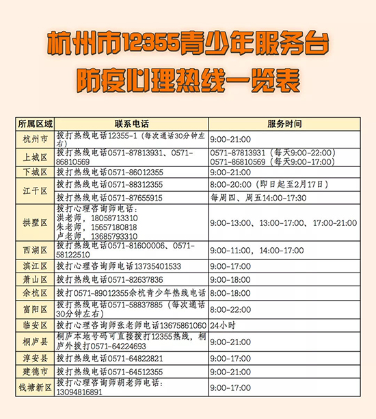 杭州市12355青少年服務(wù)臺開通防疫心理熱線,數(shù)位具有豐富經(jīng)驗的國家二級心理咨詢師將輪流值班,根據(jù)當(dāng)前疫情防控知識在線為青少年一一給予基礎(chǔ)性,預(yù)防性,科普化的理性釋疑解憂和耐心疏導(dǎo)。