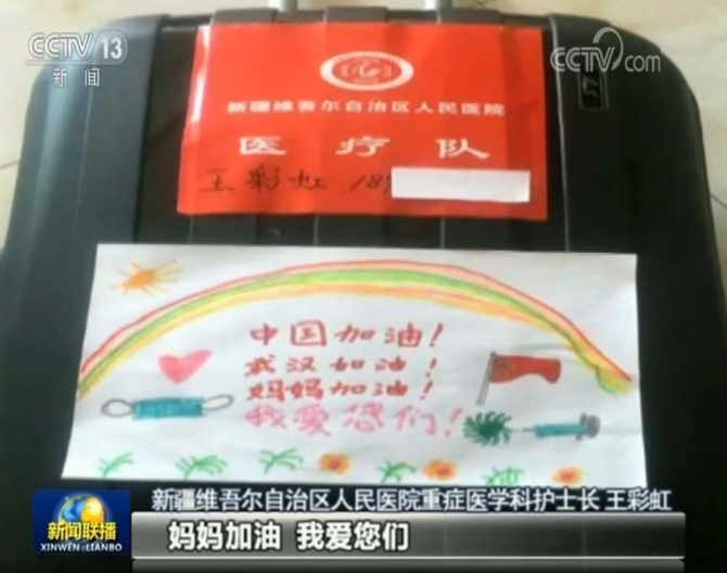 這兩天,又一批醫(yī)護人員在各地集結出征,大家的方向只有一個——那就是湖北武漢。王彩虹是新疆第三批支援湖北醫(yī)療隊的一名護士,在她的行李箱上貼著一幅兒子的畫。
