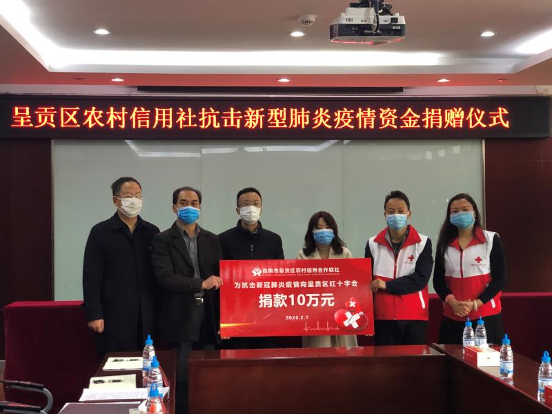昆明信息港訊 通訊員馬玲麗 2月7日,昆明市呈貢區(qū)紅十字會接收到首筆本地金融機(jī)構(gòu)捐款10萬元。在呈貢區(qū)農(nóng)村信用社抗擊新冠肺炎疫情資金捐贈儀式上,區(qū)衛(wèi)健局副局長、區(qū)紅十字會常務(wù)副會長馬勤能從區(qū)農(nóng)村信用社黨委副書記、主任吳永鴻手中接過“沉甸甸”的捐贈牌,該捐贈款項主要撥付給轄區(qū)內(nèi)醫(yī)療機(jī)構(gòu)添置緊缺的醫(yī)護(hù)物資,全力支援新型冠狀病毒感染的肺炎疫情防控工作。區(qū)政府副區(qū)長王丹,區(qū)農(nóng)村信用社黨委書記、理事長李文武等相關(guān)領(lǐng)導(dǎo)共同見證了這場簡短而飽含溫情的捐贈儀式。