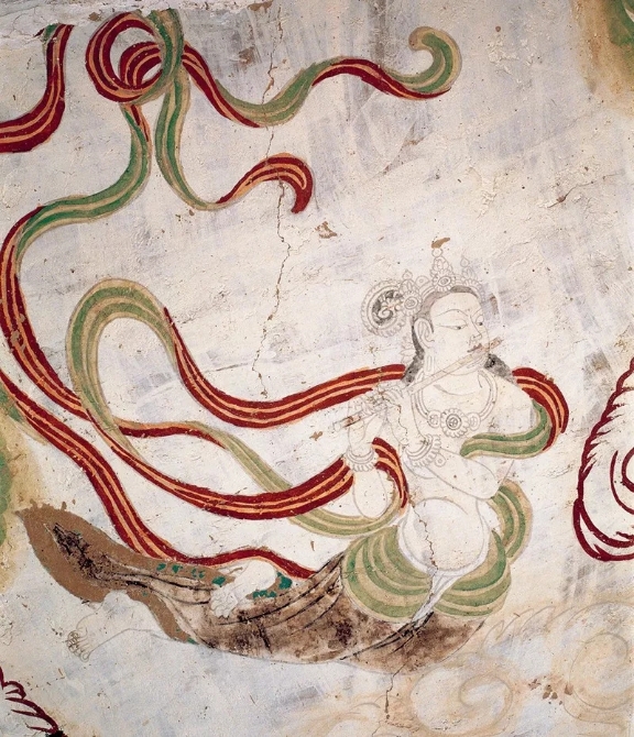 飛天是敦煌藝術(shù)的標(biāo)志之一。據(jù)統(tǒng)計(jì),僅莫高窟就繪有飛天約4500身之多,加上其余石窟,共計(jì)近6000身。圖為榆林窟第15窟前室頂南側(cè)的飛天。敦煌研究院供圖