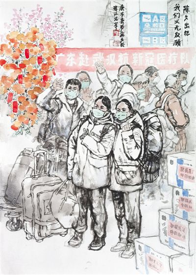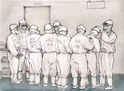 編者按:冬春之季,疫情告急,全國人民迅速行動起來,打響了一場沒有硝煙的戰(zhàn)爭。除夕前后,各地醫(yī)療隊迅速馳援武漢等疫情嚴(yán)重地區(qū)。醫(yī)護(hù)人員奔赴戰(zhàn)“疫”前線,他們筑起了健康防線,也在人們心里筑起一道信念的防線。這些天,被口罩勒到破皮的臉頰,被汗水浸到泛白的雙手,手術(shù)室外席地而眠的身影……醫(yī)護(hù)人員與時間賽跑、跟病毒搏擊,讓人民群眾真切體會到什么是白衣戰(zhàn)士的無畏、堅韌、奉獻(xiàn)。廣東醫(yī)療隊是最早抵達(dá)武漢的馳援隊伍之一,他們專業(yè)、敬業(yè)的救治,得到了患者和家屬的信任和好評。廣東醫(yī)療隊也是所有奮戰(zhàn)在抗疫一線的白衣戰(zhàn)士的縮影,他們是丈夫,是妻子,是父母;是醫(yī)生,是請戰(zhàn)者,更是勇士。他們是最美“逆行者”,他們心中有更多需要守護(hù)的人。以醫(yī)療隊發(fā)回的大量日記為素材,我們聯(lián)同中國美術(shù)家協(xié)會,組織畫家們記錄下不同尋常的一幕幕,那些瞬間注定會成為永恒的經(jīng)典。(文字采寫:吳春燕 張玉梅 于園媛)