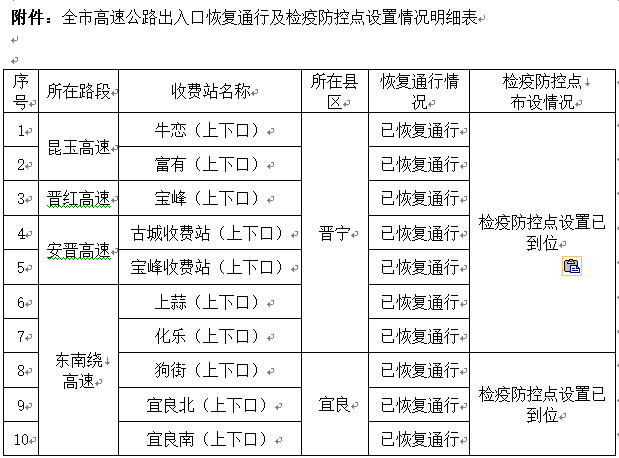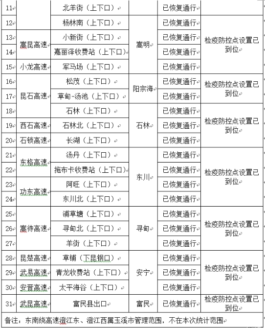 記者2月10日從昆明市交通運(yùn)輸局獲悉,根據(jù)《云南省應(yīng)對疫情工作領(lǐng)導(dǎo)小組指揮部關(guān)于保障高速公路和國省干道交通順暢的通知》,日前各縣(市)區(qū)立即對未經(jīng)云南省應(yīng)對疫情工作領(lǐng)導(dǎo)小組指揮部批準(zhǔn)關(guān)閉的高速公路出入口恢復(fù)通行,并在高速公路出口安排人員布設(shè)疫情防控點(diǎn)。截至2020年2月7日17:00,昆明市轄區(qū)內(nèi)31個(gè)已封閉的高速公路出入口全部恢復(fù)通行。