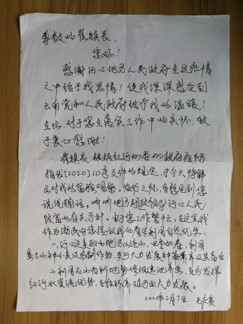 感謝信的最后,毛慶愛還建議河口利用自然優(yōu)勢(shì)大力發(fā)展種養(yǎng)殖業(yè)。據(jù)悉,毛慶愛已于2月8日上午9時(shí)乘火車離開河口。