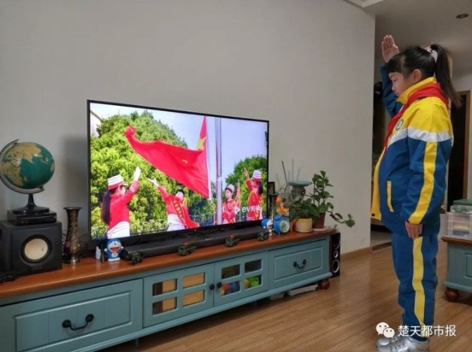 “全體立正,升國旗奏唱國歌!”今天上午8時(shí)許,武漢市江漢區(qū)武漢關(guān)小學(xué)三(1)班梁琳淼在家里參加開學(xué)典禮,她筆挺地站在電視屏幕前,胸口系著紅領(lǐng)巾,朝電腦屏幕中的五星紅旗敬禮。