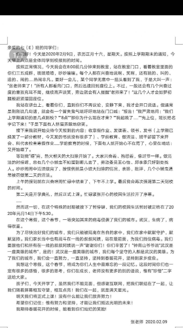 學(xué)生想上學(xué),老師想學(xué)生。在武漢市第四十五中學(xué),早上8:00,七(E)班班主任張曉霞在學(xué)生群和家長群發(fā)布了報(bào)到通知,并且附上了一封她給學(xué)生寫的信。信件描述了如果此刻在學(xué)校,師生之間相處的種種細(xì)節(jié):“某個(gè)同學(xué)無意中一扭頭看到了我,于是大叫一聲:‘張老師來了!’所有人都看向門口,然后迅速回到座位上?!薄暗鹊轿摇馈?,熱火朝天的大掃除開始了。大家興奮著、抱怨著,像過節(jié)一樣?!?……平凡、真實(shí)而細(xì)瑣,讀起來讓人淚目:老師這是有多想念自己的學(xué)生!