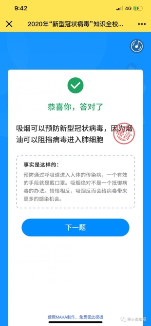 記者看到,這張?jiān)嚲硪还?0道判斷題,總分100分,題目有勤洗手和戴口罩可以降低新型冠狀病毒感染風(fēng)險(xiǎn),是真的嗎?白醋放在暖氣片可以消毒室內(nèi)空氣,是真的嗎?學(xué)生每做完一道題,都會(huì)當(dāng)即出現(xiàn)試題結(jié)果以及相關(guān)的詳細(xì)解釋。20個(gè)題做完后,還會(huì)在線出現(xiàn)考試分?jǐn)?shù)。楚才小學(xué)校長吳穎靜介紹,這些題目是老師們在網(wǎng)上進(jìn)行新聞和科普知識(shí)收集后,進(jìn)行出題,師生們還可以直接將這份網(wǎng)絡(luò)試卷推送給家人參與“考試”。