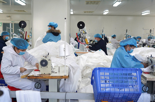 ?↑在位于江西省南昌市進賢縣的江西海福特衛(wèi)生用品有限公司生產(chǎn)車間,工人在加緊制作醫(yī)用防護服(2月1日攝)。