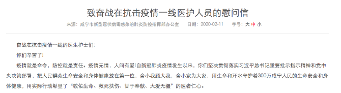 疫情就是命令,防控就是責(zé)任。疫情無(wú)情,人間有愛!自新冠肺炎疫情發(fā)生以來(lái),你們堅(jiān)決貫徹落實(shí)習(xí)近平總書記重要批示指示精神和黨中央決策部署,把人民群眾生命安全和身體健康放在第一位,舍小我顧大我,舍小家為大家,用生命和汗水守護(hù)著300萬(wàn)咸寧人民的生命安全和身體健康,用實(shí)際行動(dòng)彰顯了“敬佑生命、救死扶傷、甘于奉獻(xiàn)、大愛無(wú)疆”的醫(yī)者仁心。