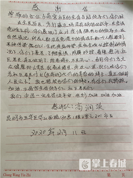 “你們辛苦了,我是住在這里的居民,平時(shí)和你們打交道的機(jī)會(huì)也比較少,這段時(shí)間我看你們每天不是張貼疫情宣傳畫就是發(fā)放宣傳冊,一遍又一遍背著噴霧器在居民院壩里消殺,真的太辛苦啦!我想向你們社區(qū)的全體工作人員表達(dá)一下我對你們的謝意,特意寫了一封感謝信,麻煩你們帶回去交給你們的社區(qū)主任?!?/p>