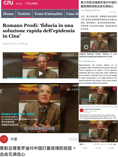 ?。保踩?,意大利前總理、歐盟委員會前主席普羅迪通過總臺發(fā)來視頻表示,面對突來的疫情,中國采取了非凡的應對措施,全國人民萬眾一心,一定可以取得最后的勝利。普羅迪特別強調(diào),世界各國息息相關,理應團結一致支持中國。