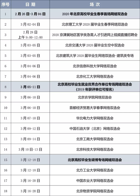 自2020年2月26日起,不同主題的網(wǎng)絡(luò)雙選會將陸續(xù)舉辦,每場雙選會持續(xù)時間為3-7天?;顒悠陂g,畢業(yè)生可登錄北京高校畢業(yè)生就業(yè)信息網(wǎng) (www.bjbys.net.cn),通過注冊審核后,即可在網(wǎng)絡(luò)雙選會期間進入各網(wǎng)上會場主頁,參與求職,可查看各場次參會用人單位簡介、招聘信息,在線投遞簡歷。