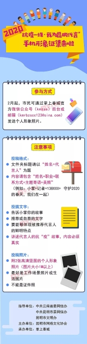 2020年在一場沒有硝煙的戰(zhàn)斗中到來。這個春節(jié),有的人沖在一線,不畏懼,不退縮;有的人陪在家人身邊,不添亂,不恐慌。每一個人都是戰(zhàn)“疫”中的戰(zhàn)士,都在用自己的方式和新型冠狀病毒肺炎戰(zhàn)斗著。在等待春暖花開的日子里,所有戰(zhàn)士都需要一個平臺講述自己的戰(zhàn)“疫”故事,都值得擁有自己的封面展示出戰(zhàn)斗的身姿,都有機會為昆明代言,代言不服輸、不放棄的春城力量!即日起,2020年云南·昆明網(wǎng)絡(luò)文化節(jié)系列活動之“抗疫一線·我為昆明代言”手機形象征集活動全面啟動?;顒佑芍泄苍颇鲜∥W(wǎng)信辦、中共昆明市委網(wǎng)信辦、昆明市文明辦指導(dǎo),昆明市網(wǎng)絡(luò)文化協(xié)會主辦,掌上春城承辦。