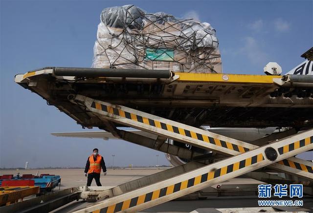 1月28日,工人在武漢天河國(guó)際機(jī)場(chǎng)卸貨。 新華社記者 程敏 攝