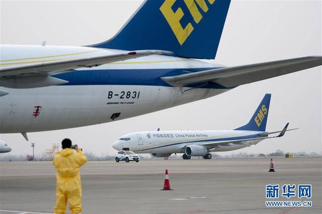 1月29日,一架載滿援助物資的中國(guó)郵政航空貨機(jī)降落在武漢天河機(jī)場(chǎng)。 新華社記者 熊琦 攝