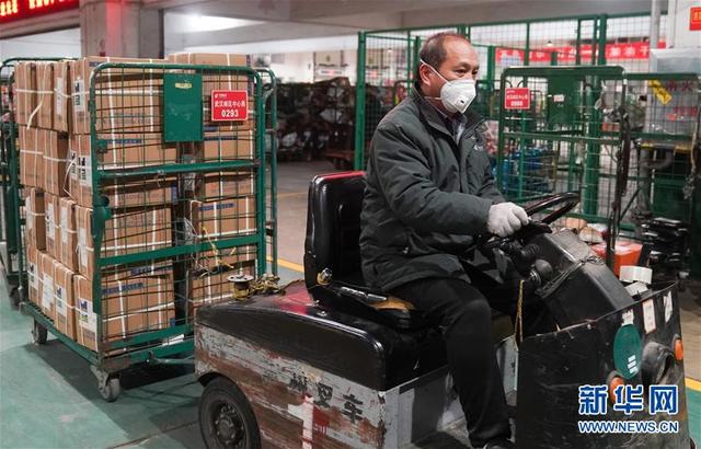 1月27日,武漢郵區(qū)中心局郵件處理中心的職工在運(yùn)送物資,準(zhǔn)備向目的地址分發(fā)。 新華社記者 程敏 攝
