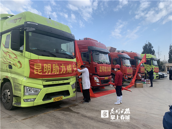 昆明信息港訊 (昆明日報 全媒體記者李雙雙) 2月15日早上9點, 6輛冷鏈物流車從昆明出發(fā),預計30個小時后,車上由昆明市向咸寧市捐贈的40噸生豬肉、56噸雞肉將運抵咸寧,第一時間分配給一線防控工作者。