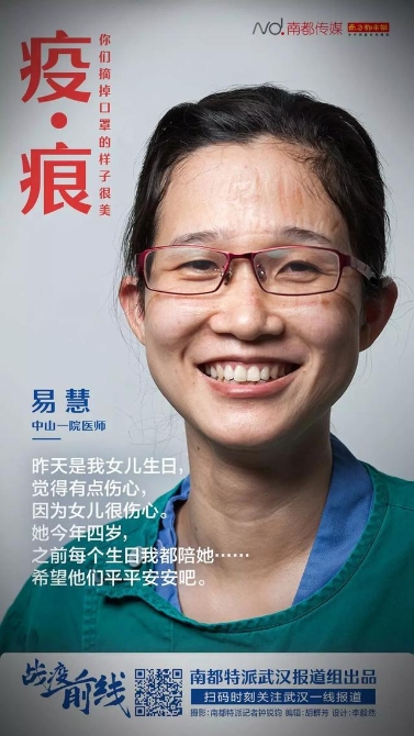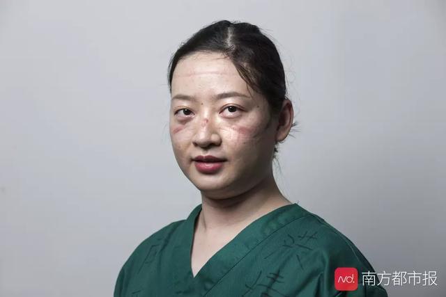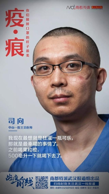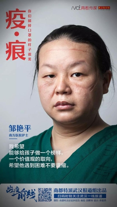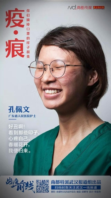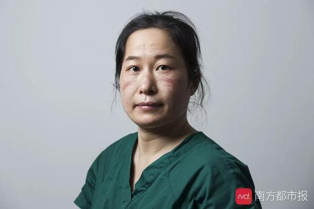 防護(hù)服穿幾個(gè)小時(shí),人就變樣子了:濕透的全身,幾乎被耗盡的體能,最可怕的是臉上的壓痕,有時(shí)幾天都不會(huì)褪去。脫下面具和口罩后的臉,好多人自己都沒細(xì)看過,也有的不忍看,因?yàn)殂俱?而且傷痕累累。