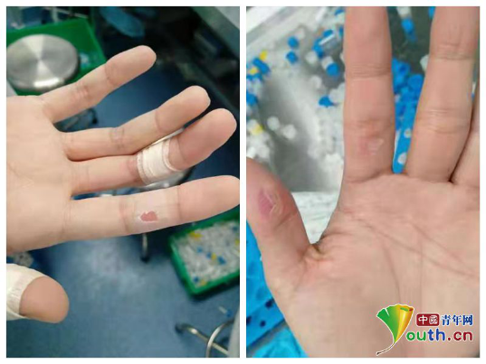 由于不停擰采集管瓶蓋,員工手指起泡、磨破,在手指上生出厚厚的繭子。采訪對象供圖
