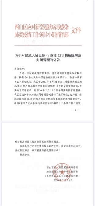 為進(jìn)一步做好疫情防控工作,有效遏制疫情蔓延和擴(kuò)散傳播,根據(jù)《中華人民共和國(guó)傳染病防治法》第四十二條第一款第(五)項(xiàng)之規(guī)定,西山區(qū)于2020年1月31日起,對(duì)綠地大城天地4b商業(yè)22-5棟采取醫(yī)學(xué)隔離封閉管理15天的緊急管理措施,并實(shí)施了現(xiàn)場(chǎng)消殺。到2020年2月15日醫(yī)學(xué)隔離封閉管理期滿,西山區(qū)已組織專家對(duì)該封閉管理區(qū)域進(jìn)行了醫(yī)學(xué)評(píng)估。經(jīng)評(píng)估,綠地大城天地4b商業(yè)22-5棟符合解除隔離封閉管理措施的條件,根據(jù)《中華人民共和國(guó)傳染病防治法》第四十二條第三款之規(guī)定,現(xiàn)按程序?qū)υ搮^(qū)域解除隔離封閉管理措施。
