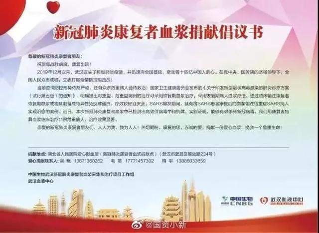 在湖北以外,一些省市的醫(yī)院也已經(jīng)開始征集新冠肺炎康復(fù)患者的血漿,用于重癥患者治療。江蘇徐州的22歲康復(fù)患者小王告訴中國之聲,她在1月25日確診,2月9日出院,醫(yī)院征求她的意見之后在13日請她簽署知情同意書,并完成抽血。