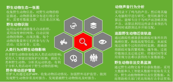 野生動(dòng)物大數(shù)據(jù)包括野生動(dòng)物一張圖,生態(tài)鏈分析,野生動(dòng)物識(shí)別,圖像、聲音、軌跡分析,動(dòng)物棲息地監(jiān)測(cè),頂級(jí)物種追蹤,物候期預(yù)測(cè),人類(lèi)行為對(duì)動(dòng)物影響分析,野外移動(dòng)巡護(hù)管理,非法捕獵、交易監(jiān)管,野生動(dòng)物養(yǎng)殖防疫管理以及城市、農(nóng)村動(dòng)物交易市場(chǎng)管理等功能。