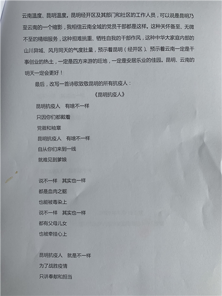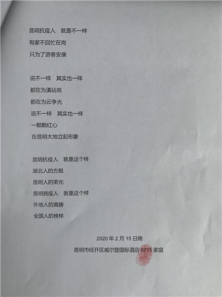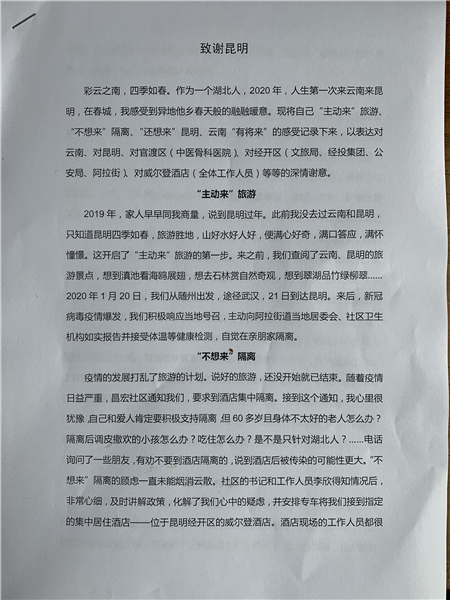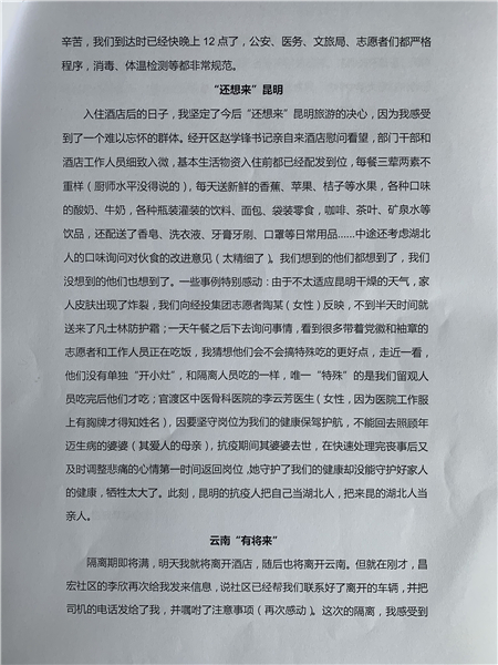 昆明信息港訊 (昆明日?qǐng)?bào) 全媒體記者黃河清)“在春城,我感受到異地他鄉(xiāng)春天般的融融暖意!這次滯昆隔離讓我感受到了昆明的溫度,真的不想再給昆明添麻煩了,想早點(diǎn)回家鄉(xiāng)為抗擊疫情做點(diǎn)事兒?!?月15日晚,是解除隔離的前夜,湖北人劉秀峰在昆明經(jīng)開(kāi)區(qū)阿拉街道辦事處威爾登酒店留觀站寫(xiě)下了一封飽含深情、充滿(mǎn)正能量的感謝信。